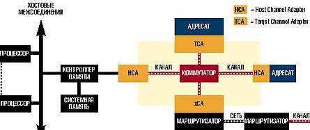 Вместо серверов с определенным количеством слотов PCI большинство систем будут поставляться просто с одним адаптером InfiniBand Host Channel Adapter (HCA). Адаптер HCA соединит компьютер с канальным коммутатором InfiniBand, подключемым к системам массовой памяти, маршрутизаторам и другой периферии, оснащенной InfiniBand Target Channel Adapter (TCA). Коммутирующая матрица реализует соединения «точка-точка».