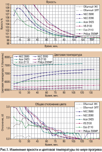 Измерения проводились каждые 5 мин в течение 2 ч; в отдельных случаях представилось необходимым увеличить продолжительность теста до 2,5 ч. Для повышения детализации на графике яркости показан диапазон 98—110%, где за 100% принято значение, установившееся на 120-й минуте. По той же причине график цветовой температуры ограничен диапазоном 6000—8000 К, так как «обычный ЭЛТ» и «обычный ЖК» продемонстрировали почти постоянную температуру в районе 9900 и 5200 К соответственно.