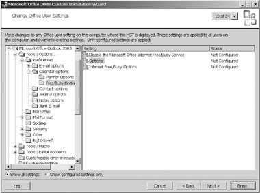 К счастью, объекты GPO — не единственный способ настройки параметров: можно воспользоваться мастером Custom Installation Wizard (CIW) из комплекта ресурсов Microsoft Office 2003 Editions Resource Kit. Как правило, CIW — предпочтительный способ, так как при его использовании не возникает побочного эффекта изменения и фиксации нескольких параметров при настройке только одного параметра. Некоторые параметры, например относящийся к объему публикуемых данных о свободном/занятом времени, позволяют устанавливать и фиксировать конфигурации, но обычно пользователи могут изменить параметры после установки.