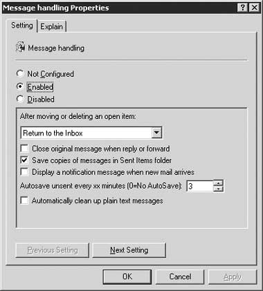 На экране 1 показан GPO, с помощью которого можно настроить Outlook на возвращение в папку «Входящие» после удаления или перемещения открытого элемента. Данный GPO управляет пятью другими параметрами. Если активизировать этот GPO с целью помешать Outlook отобразить следующее сообщение (которое может оказаться спамом), то Outlook применит и другие параметры (например, Save copies of messages in the sent items folder, Display a notification message when new mail arrives), так как они составляют часть того же GPO. Поэтому, например, если не выбрать параметр Save copies of messages in the sent items folder, то пользователь, которому нужно ответить на сообщения сразу же после их получения, не будет получать уведомлений о новом почтовом сообщении.
