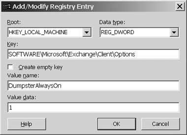 Как и при использовании других функций Outlook, удалять сообщения можно несколькими способами: щелкнув на кнопке удаления, нажав на клавиатуре клавишу Delete или комбинацию клавиш Shift+Delete. При нажатии на Shift+Delete элементы сразу же попадают в «мусорный контейнер», без промежуточного перемещения в папку Deleted Items — они прячутся «на месте» (например, в папке «Входящие») и отмечаются для удаления. По умолчанию, функция Deleted Items Recovery активна только в папке Deleted Items, что не позволяет восстанавливать удаленные «на месте» элементы из других папок. Чтобы распространить действие функции Deleted Items Recovery на все другие папки, следует изменить параметр реестра DumpsterAlwaysOn.
