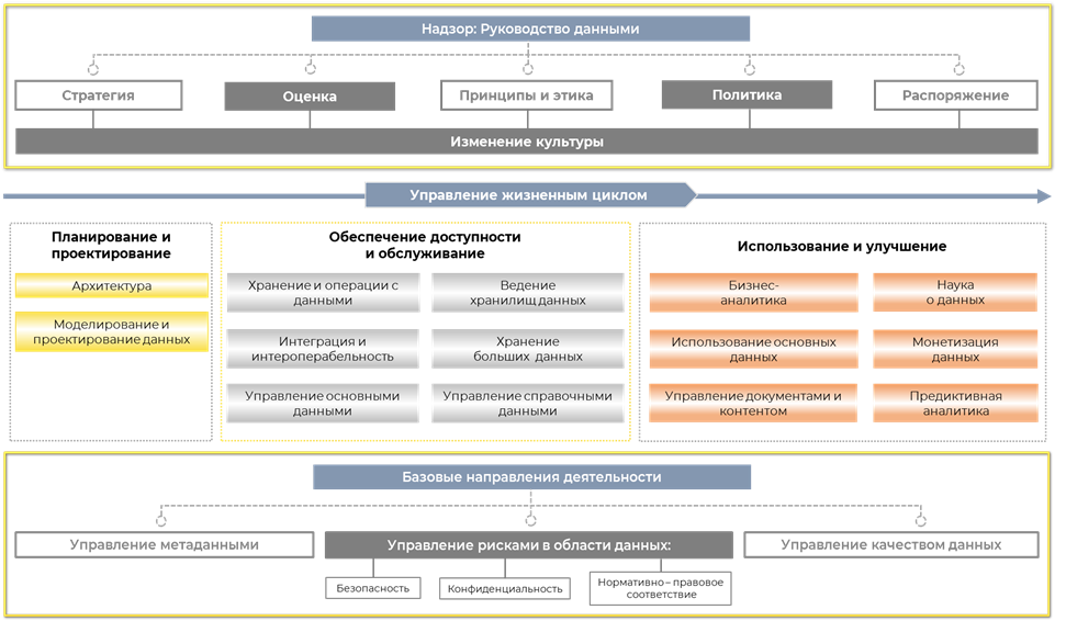 Предлагаемая структура исходит из основной цели управления данными — предоставить организациям возможность извлекать выгоду из их информационных активов так же, как и из любого другого актива. Извлечение выгоды требует управления жизненным циклом данных, поэтому функции управления данными, относящиеся к конкретным фазам жизненного цикла, помещены в центральную часть диаграммы. Начинается все с моделирования и проектирования надежных и качественных данных; затем внедряются процессы и функции, обеспечивающие доступность данных для использования и возможности по их обслуживанию; и наконец, осуществляется использование данных в различных типах аналитики, за счет чего их ценность повышается [1].