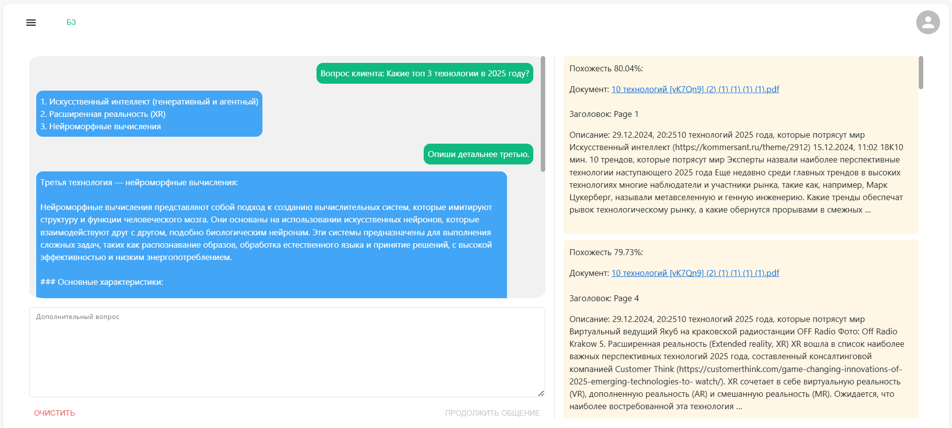 - Чат-диалог: можно задать вопрос AI-ассистенту Pro.ГенИИ обычным языком (например, «покажи договор с клиентом X») или доуточнить свой ранее введенный запрос.