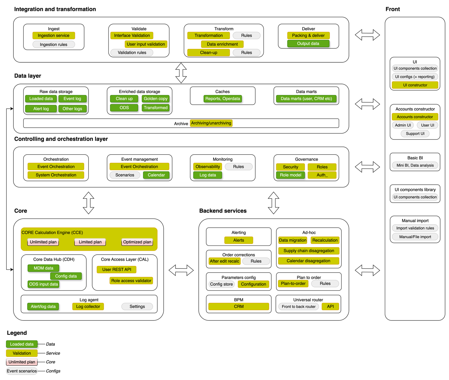 Мы создавали продукт как платформенное решение (схема 1, схема 2). В разработке используется фабрика компонентов, которая позволяет быстро собирать интерфейсы и адаптировать систему под процессы целевого заказчика с минимальной доработкой.