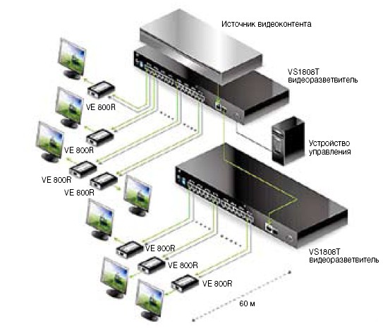 Рисунок 2. Разветвитель VS1808T обеспечивает распределение HDMI-сигнала на мониторы, удаленные на расстояние до 60 м