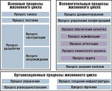 Процессы ЖЦ ПС выделены по принципу ответственности субъекта (заказчика, поставщика, разработчика и т. д.), реализующего конкретный процесс. В свою очередь, каждый из процессов состоит из ряда работ и решаемых при выполнении соответствующей работы задач. С точки зрения соподчиненности и важности данных процессов они разбиты на три группы: основные; вспомогательные; организационные.