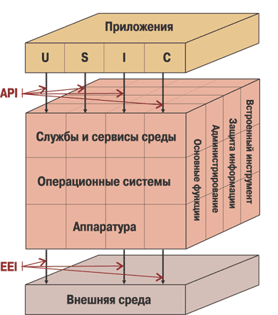 В крупном плане концептуальная модель предусматривает разбиение ИС на приложения (прикладные программные комплексы), реализующие заданные функции ИС, и среду, обеспечивающую подготовку и выполнение приложений. Между ними определяются стандартизованные API-интерфейсы.
