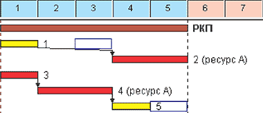 На рис. 1 проиллюстрировано понятие ресурсного критического пути и резервов времени на исполнение операций. В проекте РКП на операции 2 и 4 назначен ресурс А, который имеется в одном экземпляре, а потому они не могут исполняться параллельно. Исполнение операций 1 и 5 может быть отложено до моментов, показанных на диаграмме полыми полосками.