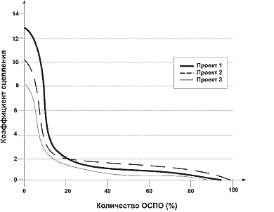 На рис. 2 показаны графики зависимости коэффициента сцепления модели от количества (в процентах к общему числу) общесистемных сущностей. Графики показывают, что 10% сущностей с наибольшим коэффициентом использования в качестве общесистемных (ОСПО) определяют наиболее сложную часть модели, при построении которой приходится анализировать отношения каждой сущности в рамках наибольшего количества бизнес-процессов (в среднем порядка 10), что определяется ее коэффициентом использования. При исключении примерно 10% наиболее используемых сущностей сцепление понижается в три-четыре раза по отношению к исходному уровню. Для последующей группы сущностей (еще 10%) сцепление уменьшается еще примерно в два раза. Около 60% сущностей используются в малом количестве бизнес-процессов, и детализация каждой из них при моделировании может быть поручена одному аналитику.