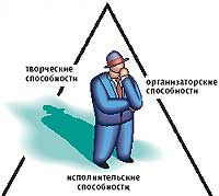 В основе одного из современных подходов к управлению персоналом, носящего название троично-матричного анализа, лежит достаточно простой принцип. Каждого человека рассматривают как триединую сущность вида "творческие способности - организаторские способности - исполнительские способности" (см. рис. 1).