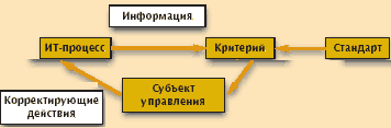В COBIT процесс управления подразделяется на четыре этапа. На первом определяется стандарт оценки эффективности ИТ-процесса. На втором — анализируется состояние ИТ-процесса путем получения субъектом управления (ИТ-менеджер) информации от объекта управления (ИТ-процесс). На третьем этапе информация о состоянии ИТ-процесса сравнивается с требованиями стандарта. На четвертом — в случае выявления несоответствия ИТ-процесса требованиям стандарта субъект управления предпринимает корректирующие действия путем передачи соответствующей управляющей информации ИТ-процессу (см. рис. 2).