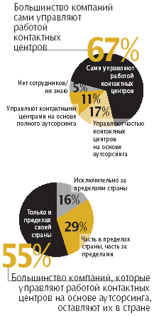 Согласно недавнему опросу, контактные центры — узлы связи (электронная почта, обмен телефонными и текстовыми сообщениями) между коммерческими структурами и их клиентами — функционируют и обслуживаются скорее силами самих компаний, чем с помощью привлеченных специалистов со стороны. Из отчета JupiterResearch следует, что 67% из 252 опрошенных компаний управляют своими контактными центрами, используя внутренние ресурсы, и только 28% привлекают к управлению хотя бы частью своих контактных центров специалистов со стороны. (Только 11% опрошенных утверждают, что управляют всеми действиями контактных центров на основе аутсорсинга.) Годовой доход компаний, участвовавших в опросе, составляет минимум 50 млн. долларов.
