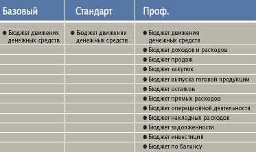 Большинство российских программ, помимо предоставляемой возможности формирования своей системы бюджетов, предлагает стандартные наборы функций. (Вероятнее всего, это удобное в использовании наследие более ранних версий систем.) Например, в поставку типового продукта «Инталев: Бюджетное управление» входит три комплекса бюджетов: «Базовый», «Стандарт» и «Проф.». Комплексы бюджетов объединены принципом разработки и отличаются друг от друга количеством доступных бюджетов (см. таблицу).