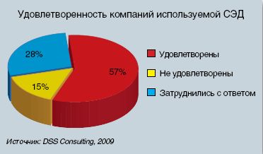 Согласно результатам опроса, проведенного DSS Consulting, большинство компаний, внедривших системы электронного документооборота, удовлетворены выбранным решением. При этом 28% не смогли однозначно сформулировать свои впечатления относительно корпоративной СЭД, а 15% отметили явные неудобства в работе с ней. В числе основных причин неудобств названа излишняя громоздкость созданной системы, что может говорить о несоответствии функционала поставленным целям и задачам; некоторые респонденты отметили не слишком удобный интерфейс; 6% затруднились назвать причину своей неудовлетворенности, отметив лишь сам факт ее наличия. Как подчеркивают аналитики, ключевым фактором для дружественного восприятия системы в большинстве компаний является именно удобство обращения с системой, ее эргономика, а не функциональные возможности.