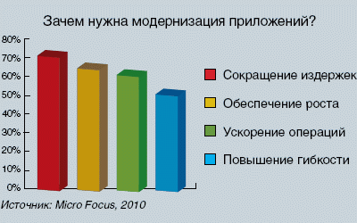 Наиболее ярко эти настроения выражены в финансовой отрасли, а самыми оптимистичными являются ИТ-руководители торговых компаний. Как оказалось, модернизация существующих приложений и переход на более современные платформы рассматриваются как главный способ снизить ИТ-расходы. В настоящее время 86% опрошенных компаний реализуют такого рода проекты. Среди тех, кто выполнил проекты по модернизации информационных систем, 70% заявили, что это поможет сокращению операционных издержек, 63% полагают, что таким образом удалось обеспечить будущий рост бизнеса, 60% говорят о повышении скорости операций, а 50% — о повышении гибкости компании.
