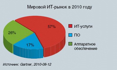По оценкам Gartner, в 2010 году мировой ИТ-рынок достигнет отметки в 3,35 трлн долл., что составит рост 3,9% по сравнению с показателем 2009 года. Новый прогноз скорректирован в сторону снижения. В начале года аналитики говорили о росте, превышающем 5%. Однако значительных изменений тенденций в Gartner не увидели, а основной причиной корректировки стала девальвация евро по отношению к доллару. Наиболее активно растущим сегментом является компьютерное оборудование. По итогам 2010 года он может вырасти более чем на 9%.