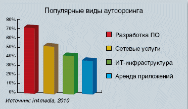 В ближайшие два года большинство российских компаний намерены сохранить или расширить объемы ИТ-аутсорсинга. По данным опроса, проведенного in4media, к 2012 году абсолютное большинство крупных российских предприятий будут приобретать те или иные услуги ИТ-аутсорсинга. При этом 73% опрошенных предприятий уже привлекают внешних поставщиков ИТ-услуг. Наиболее популярными услугами остаются аутсорсинг разработки ПО и аутсорсинг сетевых услуг. Интересно, что абсолютное большинство компаний считает свой опыт аутсорсинга ИТ-услуг успешным и утверждает, что он помог достичь поставленных целей.