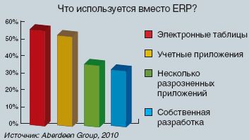 Большинство компаний не имеют внедренных ERP-систем и не собираются менять существующее положение вещей. По данным Aberdeen Group, полноценная ERP внедрена в 41% компаний, а в сегменте предприятий SMB эта доля составляет 29%. Разумеется, степень проникновения систем управления предприятием сильно зависит от конкретной отрасли, и лидером является машиностроение. При этом лишь 17% компаний отмечают, что собираются инвестировать в ближайшие годы в ERP.
