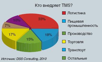 Число внедрений в российских компаниях систем управления транспортной логистикой (Transportation Management System, TMS) в 2010 году на 3–5% превысит показатели 2008 года, как прогнозируют в DSS Consulting. Отраслевая структура спроса на TMS-системы закономерно демонстрирует лидерство среди заказчиков логистических компаний — их доля составляет 33% от общего количества внедрений. Кроме того, значительную часть составляют предприятия пищевой промышленности, торговли и производства.