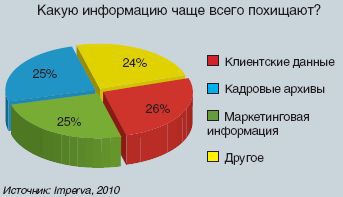 В «сливе» клиентских данных анонимно призналось 26% опрошенных сотрудников. Чуть реже похищают кадровые архивы и маркетинговую информацию — в этих грехах созналась четверть респондентов. Более того, почти половина сотрудников заявили, что их коллегам по работе также случалось похищать у компании данные; большинство осведомленных об этом полагают, что в результате информация ушла к конкурентам.