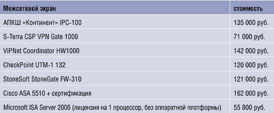 | Таблица 1. Сравнение стоимости межсетевых экранов |