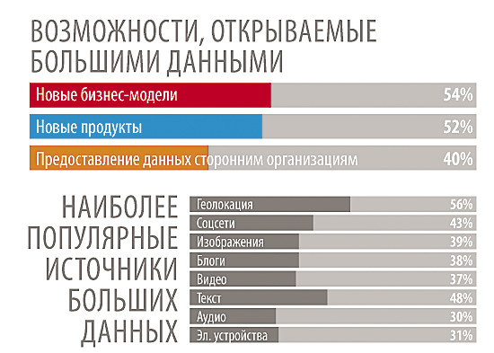 Тем не менее лишь 21% ИТ-директоров разделяют мнение, что анализ Больших Данных является важнейшим способом достижения конкурентных преимуществ, а 38% назвали его в числе пяти приоритетных способов. Наиболее высоко потенциальные возможности Больших Данных оценили в компаниях розничной торговли, указав, что в их бизнесе сбор и анализ данных являются основой сохранения конкурентоспособности. Что вполне логично, наибольших результатов достигли компании, где работа с Большими Данными получает поддержку руководства.