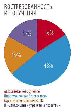 Как отмечают аналитики Академии «АйТи», в компаниях снижается интерес к авторизованному ИТ-обучению по продуктам западных компаний. Планы на обучение по таким программам озвучили лишь 16% опрошенных компаний. В первую очередь востребованы программы по информационной безопасности, необходимость в них отметили 48% участников исследования, а курсы для пользователей ПК интересны 19% респондентов. Кроме того, зафиксирован спрос на курсы по бизнес-направлениям, связанным с ИТ-менеджментом и управлением проектами.