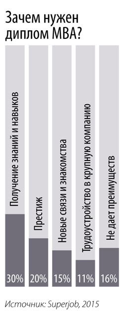 Основное в бизнес-образовании, по мнению руководителей, – получение знаний и навыков, необходимых для успешной работы. Кроме того, каждый пятый уверен, что обладание степенью МВА сулит престиж в глазах работодателя и партнеров по бизнесу. Новые связи и знакомства в бизнес-среде считают главным приобретением 15% опрошенных, а в перспективах трудоустройства в крупную отечественную или зарубежную компанию уверены 11% опрошенных. Между тем HR-специалистов, назвавших диплом МВА конкурентным преимуществом при трудоустройстве на руководящие позиции, – всего 19%.