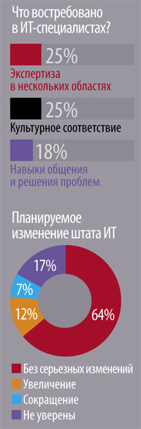 25% компаний заявляют, что ищут специалистов «с экспертизой в определенных областях», не уточняя, в каких именно. Еще 25% пытаются найти сотрудников, хорошо вписывающихся в корпоративную культуру компании. Наконец, 18% более всего заинтересованы в ИТ-специалистах, имеющих отличные навыки общения и умеющих «решать проблемы».