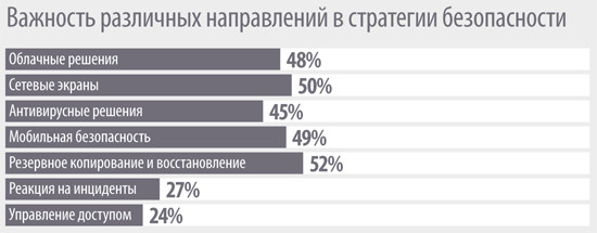 Во-первых, директора по ИТ-безопасности считают кибербезопасность приоритетом номер один для своей компании. Эту точку зрения разделяют только 5% руководителей бизнеса. Кроме того, бизнес и ИТ расходятся в том, какие активы необходимо защищать в первую очередь. Первый отдает приоритет стратегическим активам (например, репутации компании), а вторые используют тактический подход, концентрируя свое внимание на защите данных и приложений.