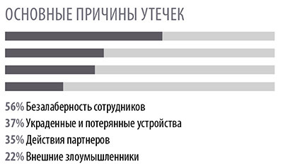 Первостепенная причина происшедших инцидентов – это безалаберность сотрудников. Второе место делят украденные и потерянные устройства, а также ошибки партнеров. Внешние злоумышленники ответственны лишь за 22% утечек.