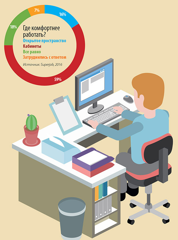 По данным исследовательского центра Superjob, сторонники открытых офисных пространств оказались в явном меньшинстве. За работу в open space высказались всего 16%, а за кабинетную систему – в 3,5 раза больше. При этом 18% опрошенных безразлично, как организовано пространство офиса.