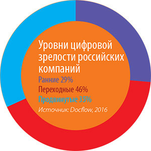 По данным информационно-аналитического проекта Docflow, в России более половины компаний уже включили цифровую трансформацию в свою бизнес-стратегию. Исследование показало, что уровень развития российских компаний в направлении цифровой трансформации аналогичен мировому.