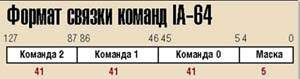 По три обычных команды, имеющих длину 41 разрядов, объединяются в связки длиной 128 разрядов (см. рис.). Пять разрядов отводятся под так называемую маску (template), которые указывают на взаимозависимости команд в связке, препятствующие их одновременному выполнению, и на то, какие типы команд в каких разрядах связки находятся.