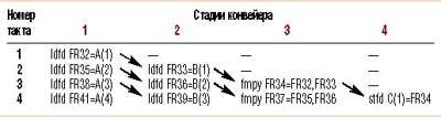Здесь представлены по две команды загрузки регистров, их умножение и запись результата в память, причем для простоты мы опускаем детали адресации к элементам массива. Предположим для простоты, что все команды выполняются за один такт. Тогда развертка конвейеризованного цикла по времени будет выглядеть следующим образом: