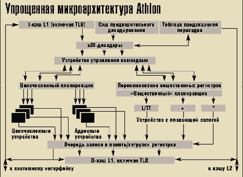 Cобственно, совокупность вышеуказанных факторов уже объясняет, почему производительность Athlon выше, чем в Pentium III. В Athlon имеется три целочисленных устройства против двух в Pentium III, а устройств с плавающей запятой в Athlon — три (в Pentium III — одно). Кроме того, Athlon содержит три адресных устройства. Все исполнительные устройства способны работать во внеочередном режиме. Для этого в арифметических устройствах имеются «планировщики», содержащие очереди команд емкостью 18 (для целочисленных устройств) и 36 (для вещественных устройств) строк соответственно.