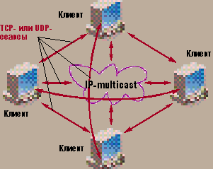 Однако для полноценной работы самих широковещательных сообщений еще недостаточно. Как правило, нужно создавать дополнительные каналы для управления отдельными клиентами, устройствами и приложениями, для чего лучше всего подходят уже используемые протоколы UDP и TCP. В результате структура связей широковещательного приложения в общем случае выглядит так, как показано на рисунке. Впрочем, поскольку контрольная информация, как правило, занимает меньшую полосу пропускания, то дополнительные управляющие каналы не сильно влияют на передачу основной информации.