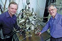 | Стенли Уильямс, директор Hewlett-Packard по исследованиям в области квантовых вычислений, и Филип Кейкс, руководитель компании по науке, демонстрируют туннельный микроскоп, сыгравший немалую роль в исследованиях наномира |