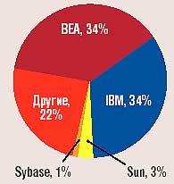 | Лидеры рынка серверов приложений — компании BEA Systems (ей принадлежит, по данным GartnerGroup, 34% рынка, оцениваемого этой исследовательской компанией в 1,8 млрд. долл.) и IBM (31%). Преследователи — Sun и Sybase — заметно отстают от этих двух компаний. |