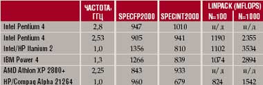 Итак, Pentium 4 является лидером по производительности не только среди всех х86-совместимых процессоров (иллюстрацией этого может служить приведенная таблица). Скажем, на тестах Linpack (n=100) Pentium 4/2,53 ГГц опередил не только все RISC-процессоры, но и Itanium 2, и процессоры векторных суперкомпьютеров. Что касается выбора собственно процессора, то здесь рекомендация очевидна: сегодня целесообразно приобретение Pentium 4 с кэшем второго уровня емкостью 512 Кбайт и частотой системной шины 533 МГц. Последнее дает возможность в перспективе перейти на процессор с большей частотой, не столкнувшись с ограничением роста производительности со стороны памяти.