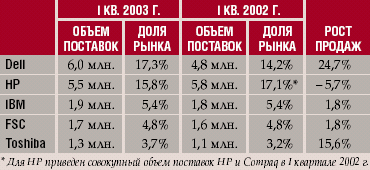 Сместив акцент в поставках персональных компьютеров с потребительского рынка на продажи крупным заказчикам, корпорация Dell Computer по итогам первого квартала 2003 года вернула себе лидерство на мировом рынке ПК, отобрав его у Hewlett-Packard.