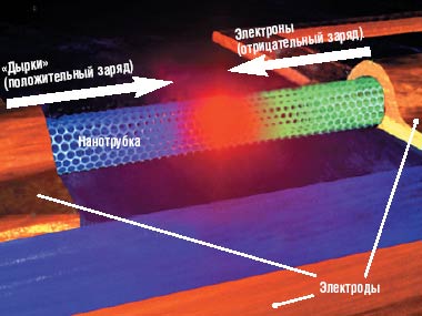 | Твердотельный излучатель света состоит из одной углеродной нанотрубки, имеет диаметр 1,4 нм и выполнен как транзистор с тремя контактами |