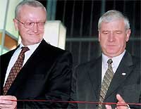 | Геннадий Козлов, генеральный директор Российского агентства по системам управления, и начальник Госгортехнадзора РФ Владимир Кульечев открывают MIIF 2003 |