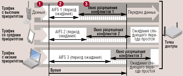 1.- Телефон с поддержкой беспроводной передачи данных, КПК и мобильный компьютер являются источниками трафика, для которого должен быть установлен приоритет — высокий, средний или низкий. По окончании передачи пакета (в данном случае — телефоном) точка доступа подтверждает его получение. 2.- После того, как было отправлено подтверждение, наступает период ожидания, именуемый AIFS (Arbitration Interframe Space), в течение которого передающие станции не пытаются отправлять данные. Для трафика с более высоким приоритетом промежутки времени AIFS короче, чем для трафика с более низким приоритетом. 3.- Дождавшись наступления своего окна разрешения конфликтов, каждая из передающих станций начинает обратный отсчет временных слотов. Как только одна из станций (в данном случае — телефон) завершает этот отсчет и, получив доступ к беспроводной сети, начинает передачу данных, остальные свой отсчет прекращают. |