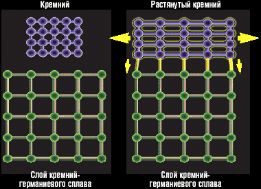 Метод растянутого кремния состоит в помещении слоя кремний-германиевого сплава (SiGe) поверх кремниевой основы, в результате чего в ее веществе увеличиваются межатомные расстояния и скорость прохождения электронов по схеме возрастает.