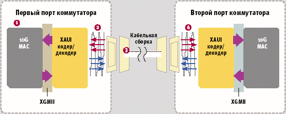 - Технология предусматривает применение того же контроллера 10 Gigabit MAC, интерфейса XGMII и устройства кодирования/декодирования XAUI, что определены в спецификации 802.3, для передачи сигнала по четырем дифференциальным парам со скоростью 3,125 Гбит/с