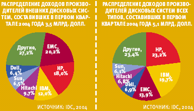 В сфере традиционного бизнеса положение EMC вполне стабильно. По данным IDC, в первом квартале 2004 года в сегменте внешних систем EMC принадлежало 20,2% объема продаж при их 26-процентном росте по сравнению с тем же кварталом 2003 года. Более 90% данного сегмента определяют RAID-массивы. В этой области первое и второе места по продажам занимают также EMC и HP с 22,0 и 16,9% рынка