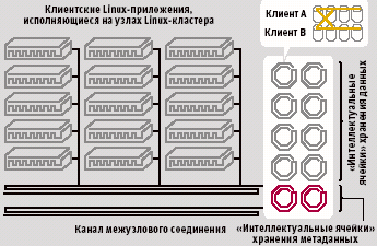 В ячейках метаданных содержится информация о файлах; клиентские приложения взаимодействуют с ними непосредственно при любых манипуляциях с файлами, при поиске по каталогам и других операциях. Ячейки метаданных дублируются в режиме «активный — резервный».