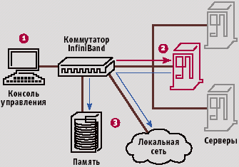 - Программное обеспечение VFrame, встроенное в коммутатор Topspin InfiniBand, позволяет ему связываться с инструментами управления, такими как Tivoli Intelligent ThinkDynamic Orchestrator корпорации IBM. Политики, реализованные в программном обеспечении Tivoli, укажут коммутатору, поддерживающему VFrame, что когда трафик достигает определенного порогового значения, к сети должен подключаться другой сервер, имеющий определенный процессор и удовлетворяющий определенным критериям памяти.
