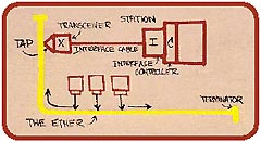 | Эту схему Ethernet-системы Боб Меткалф использовал в своем докладе на конференции National Computer Conference в июне 1976 года |